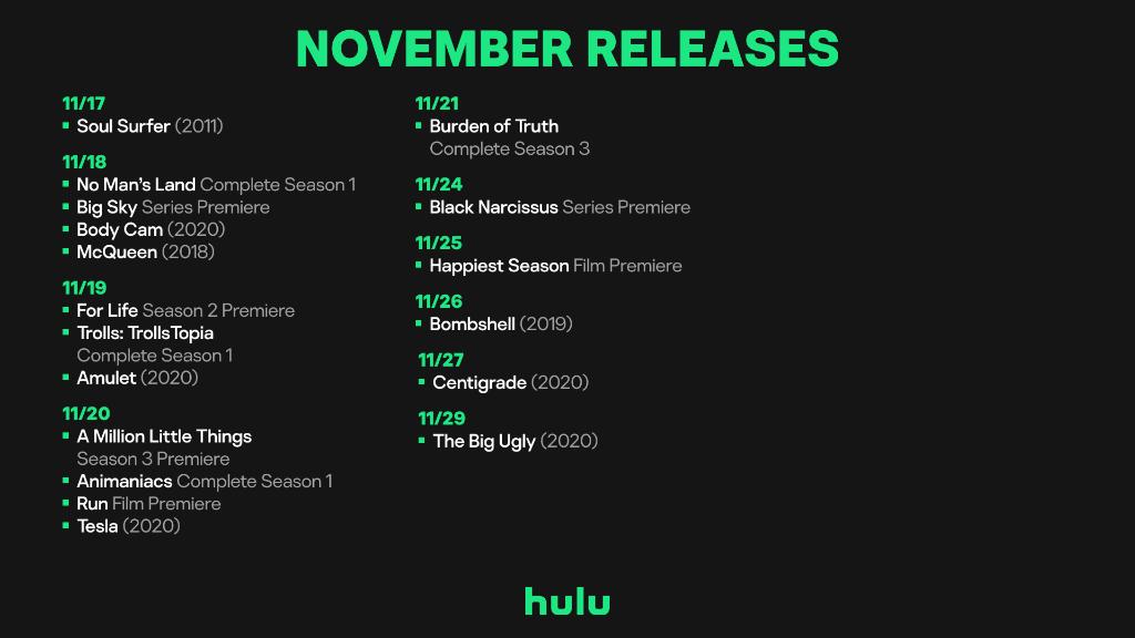 A full list of movies TV shows and specials coming in November 2020 to Netflix Hulu and Amazon Prime.